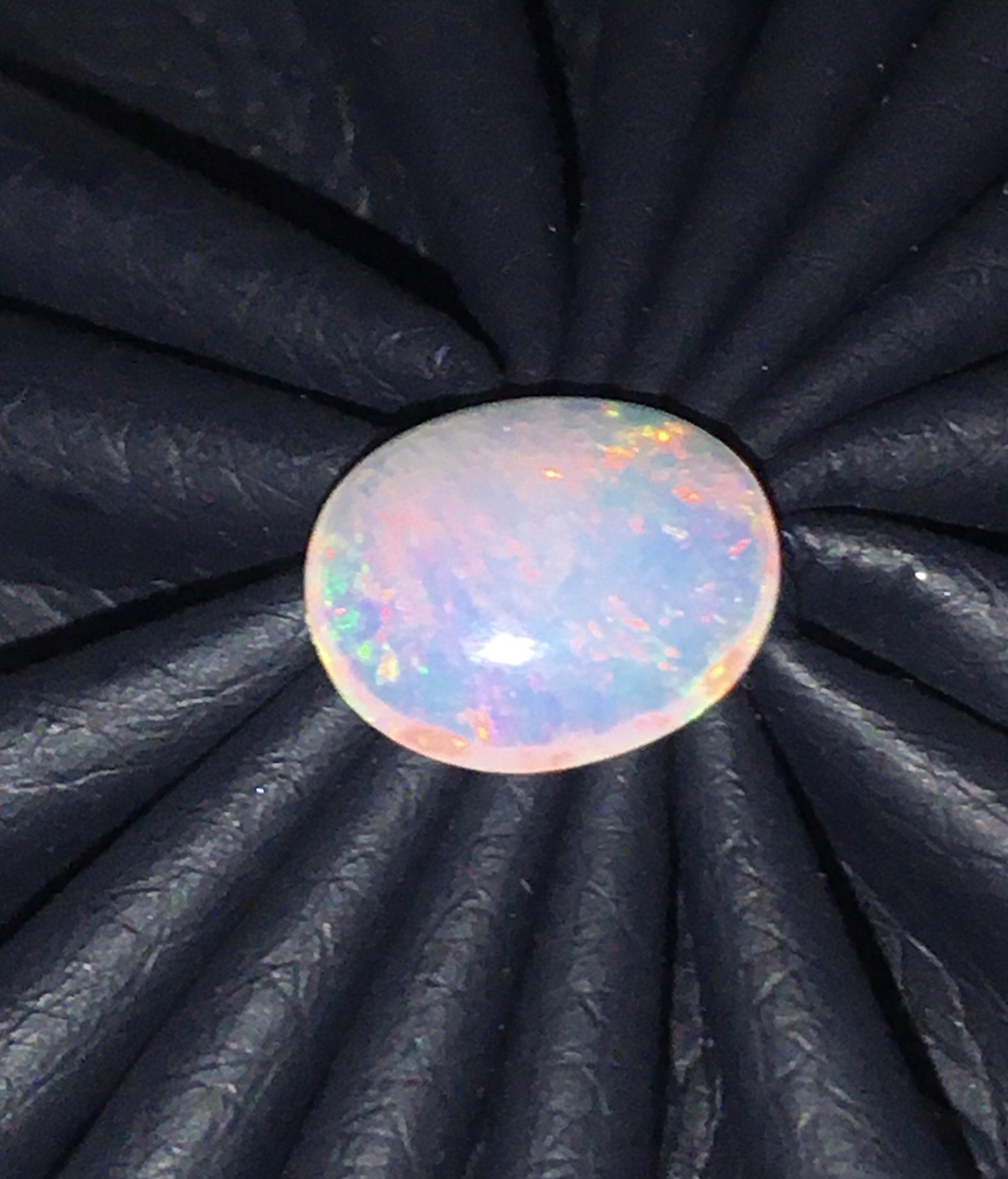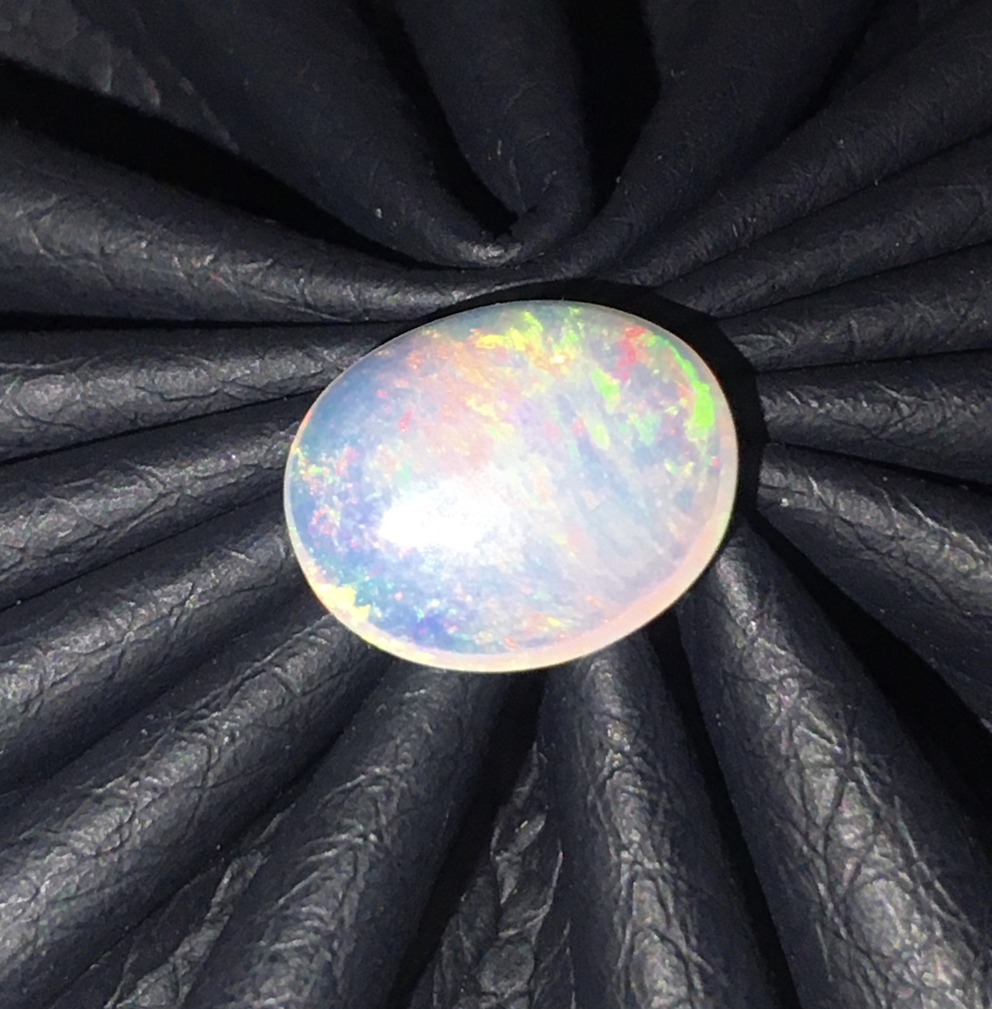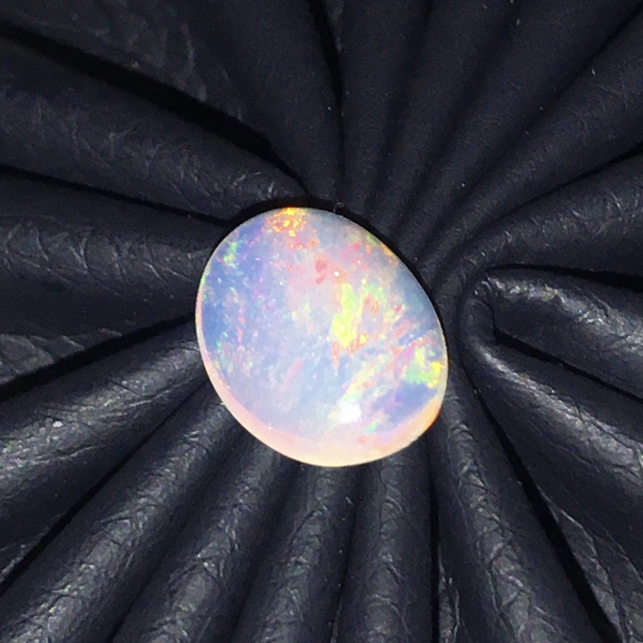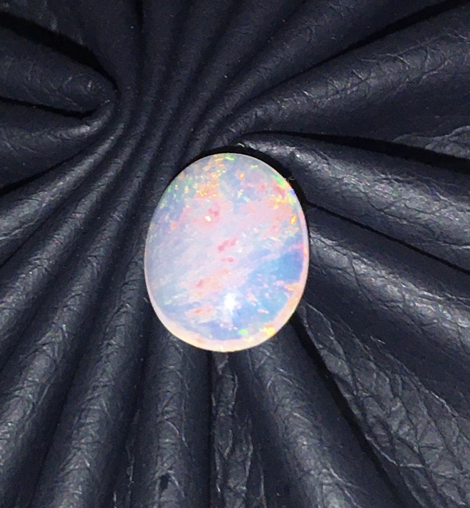 พลอยโอปอลขาวเล่นแสงสีรุ้งตามธรรมชาติมีเสน่ห์มากค่ะแต่ละมุมแสงสีต่างกันไป เม็ดนี้หน้ากว้าง 2.44 กะรัต ทำหัวแหวนหรือจี้ได้สวย